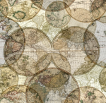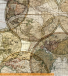 This fabric features a vintage world-map print made up of overlapping circular globes arranged in a repeating pattern. Each globe shows antique-style cartography with detailed coastlines, latitude and longitude lines, and softly faded place names.